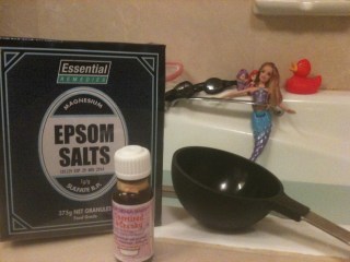 We usually dissolve half a cup of Epsom Salts into a bathtub of warm water, more if it’s a deep bath. I prefer to pour some Epsom Salts into very warm water in a separate container, stir until completely dissolved, then I pour it into the bathtub. My hubby takes a shortcut and just dump the salts into the tub. This tends to leave the bottom of the tub gritty, it takes a long time to dissolve and can be extremely uncomfortable for female private parts. We call this ‘sandy bottom syndrome’ in our home, usually occurs when Daddy is in charge of bath time and I’m not there to remind ie. nag him. So, for Super Dads out there with daughters, remember to pre-dissolve the salts first!