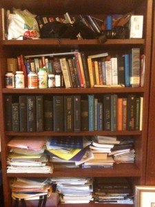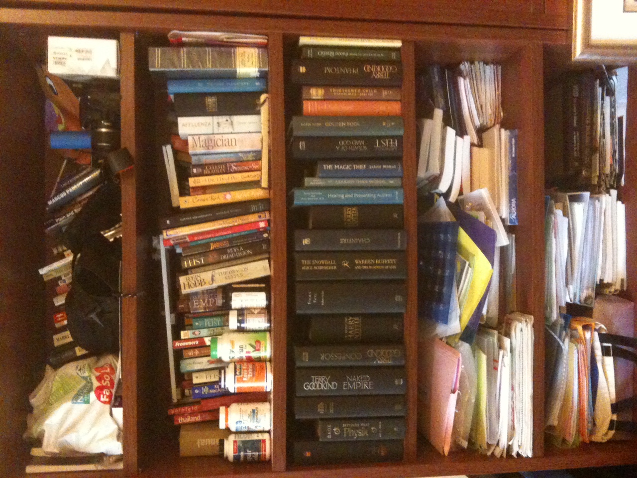 Our one bookcase was crammed with my collection of Sci-Fi books, the chick-lits that I couldn’t bear to be parted with, numerous autism books, May’s ABA program notes, both girls’ medical test reports, conference notes, ASD products literature, leftover jars of supplements and naked hardcover books because the girls love to take the dust jackets off. Not to mention hubby’s serious non-fiction books. He used to hide my girly books behind his books out of embarrassment when people came to visit!I wonder what a psychiatrist would say if he ever took a peek at my bookshelf. Does this represent a chaotic sociopathic mind? Or merely a typical Autism mum who is juggling countless balls in the air kinda bookcase?