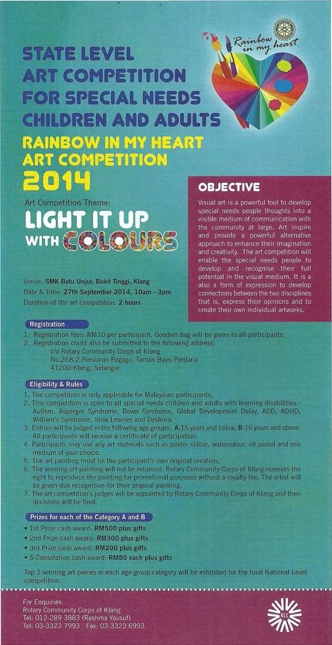 Please attend the Rainbow In My Heart competition this weekend, organised by my good friends at the Autism Society of Klang and the Rotary Community Corps. Visual art is a powerful tool to develop special needs people thoughts into a visible medium of communication with the community at large. Please support our local artists with special-needs!