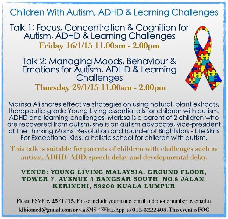 It’s not too late to register for the talk this Thursday! I will be sharing on my experience as well as case studies on managing moods, behaviour and emotions for children with autism, ADHD and learning challenges. About the speaker – Marissa is a mother of 2 children who are recovered from autism. She is an autism advocate, writer, special-needs educator and passionate about natural health. Seats are limited, please RSVP by email to klbiomed@gmail.com or SMS/ WhatsApp to 012-3222405 by 28/1 with your name, phone number and number of pax.