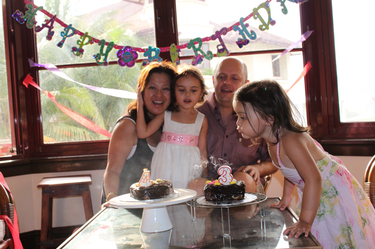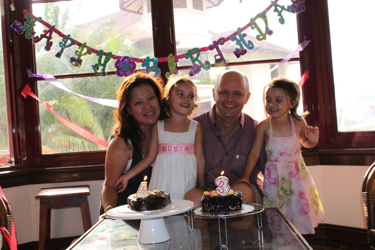It was Paul’s birthday recently, Maya decided Daddy deserved a home-made cake, so each girl made a cake each with a candle on top. They banned Paul and I from the kitchen, together with the nanny, they made the cake and decorated it. We had a little party at home and they surprised us with the lovely cakes. Paul is a proud daddy indeed, the girls love him deeply and they show their love every day.