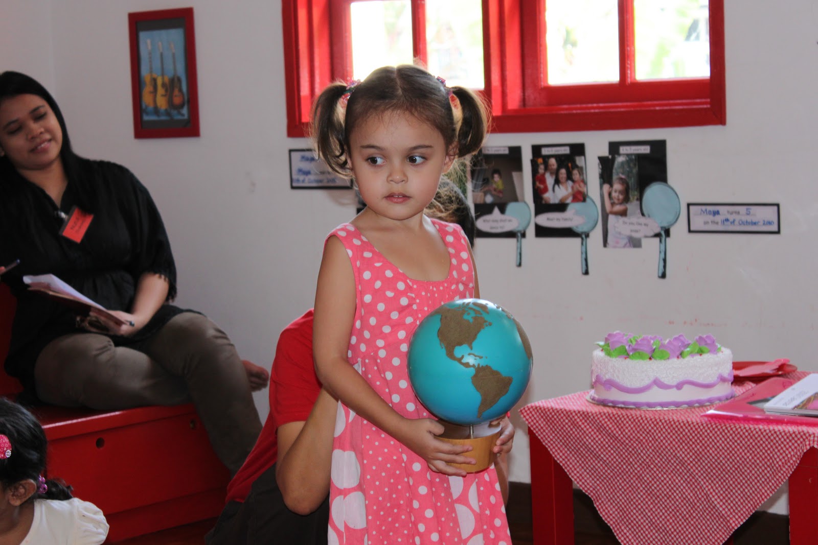 Maya turned 5 years old last week. So we had a little birthday celebration for Maya in school. The school has a birthday ritual called the Birthday Walk. The birthday girl walks around the globe the number of times as her age. The parent will show some photos and tell her classmates of her life. I had brought in a birthday cake and the teachers helped to put up some photos to show her class. Maya was very proud to hold the globe and walk around. She blew out the candles and cut her cake. She also told her classmates and teachers about each and every photo. She is a great little speaker, her teachers told me later on how great her speech was. Her classmates were very nice kids, Maya was part of a clique of girls and played well with each other. It was heartening to see how well Maya was doing.